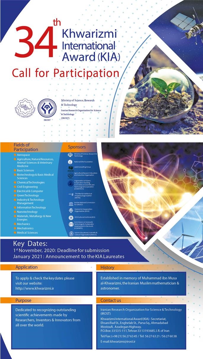 The executive Committee of the 36th Edition of the Khwarizmi International Award is pleased to call for applications. Researchers, Inventors and Innovators from around the world are invited to take part in this unique multidisciplinary scientific contest.