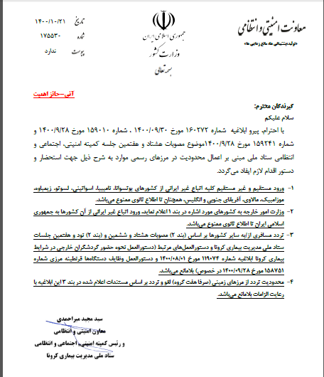 آخرین ابلاغیه جهت تردد به ایران